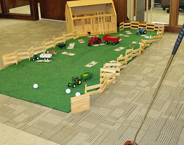 Along with cookies all week, cupcakes on Friday, and the Thursday community appreciation dinner, Farmers Savings Bank-Vinton is celebrating the banks 100th anniversary with a mini-golf game that allows customers a chance to win some cash. Any player whose putts lands on a replica bill with an employee's face on it wins that amount in real money.