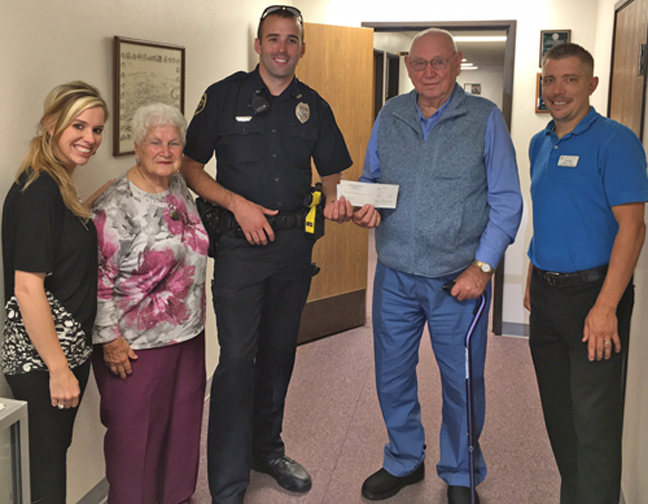 Lutheran Home activities director Sarah Smith, residents June Salenro, and Marvin Witt, and Chef Justin Ealy presented K-9 Ben Parmater the check after the final drive-thru of the season.