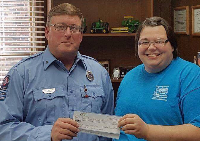Vinton Fire Chief Gary McKenna receives the Tootsie's donation from Michelle Seibert.