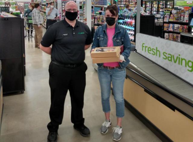 The first shopper at the new Hy-Vee, Michelle Ruess made a purchase of Bakery goods as did the second shopper.