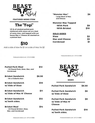 Logan Merchant, the owner, got into the business because, "I've always enjoyed cooking, and the last few years I've really become passionate about it! I especially love serving food to the people." You can find Beast and Bird in the parking lot of Tactical Creations on Thursday evenings from 5-8:30 p.m. Merchant plans to be adding more dates and locations as he goes forward, so he said, "the best bet to know where the trailer will be is to follow my FB page," which can be found if you click on the Beast and Bird headline above. There is also a current menu in the pictures.