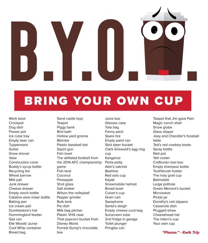 The flyer they put out jokingly sai, B.Y.O.C. (Cup) Then the company included a list of suggestions like your work book, a crockpot, the dog dish, a flower pot, ice cube tray, an empty beer can, your guitar, a vase a milk bag pitcher, pie dish, your kayak, well, you get the picture.