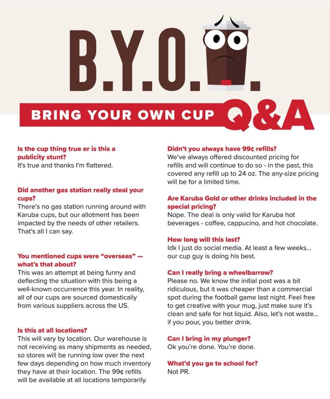 When a shortage of coffee cups affected Kwik Star convenient stores/gas stations, they released an amusing flyer concerning the situation.