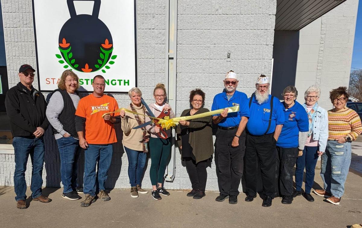 Joining Stark for an official ribbon cutting were Eric Henry of Arnold Motor Supply, Vinton Unlimited members, Dandeena Schadle, Pourville Art Studio & Gallery, Andrew Elwick, Elwick Electric, Tami Stark, Iowa Land Management and Real Estate Company, Erin Stark of Stark Strength, Melody Snow, Vinton Unlimited, Dale Henry, Jerry Huffman, and Jeanette Henry of the VFW Post #8884, Connie Ogier, Iowa Land Management and Real Estate Company, and Karilea Ries of Cameron Clothing Company and Henkle Creek Mercantile.