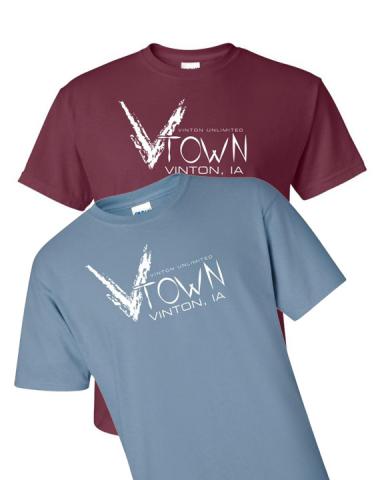 These shirts were designed by Kelsey H., a high school student in Vinton. They started as a fundraising idea for Vinton Unlimited and we hope to have everyone in town wearing a V-Town shirt by the end of the summer! Get one for you AND your kids right away!
