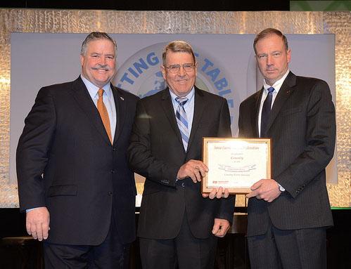 Robert Ritscher received the Benton County Farm Bureau recognition award at the Iowa Farm Bureau Federation (IFBF) annual meeting in Des Moines on December 7, 2011. IFBF Past President Craig Lang (left) and newly-elected President Craig Hill (right), made the presentation to Ritscher (center).
