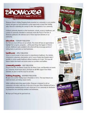 Showcase publications are designed to be ambassadors for everything positive about our community. Sent through the postal service to 10,000 mailboxes in all the towns surrounding Vinton, Showcase publications will introduce what Vinton offers to both rural residents and residents of nearby communities. We will also be posting all the Showcase content on both Vinton Today and Vinton Unlimited’s website, extending our reach even further.