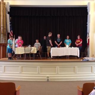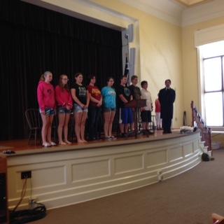 Pic 2 - singing the Doxology before dinner - l to r - Tucker Mensen, Brylee Bruce, Levi Menson, Alex Vaxquez, Austin Dougherty, Logan Murray, Molly Cummings, Shannon Fox.