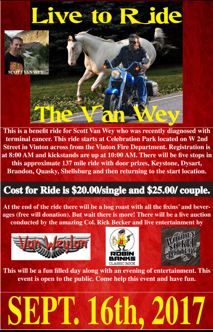 This ride starts at Celebration Park located on W 2nd Street in Vinton across from the Vinton Fire Department. Registration is at 8:00 AM and kickstands are up at 10:00 AM. There will be five stops in this approximate 137 mile ride with door prizes, Keystone, Dysart, Brandon, Quasky, Shellsburg and then returning to the start location. Cost is $20.00/single and $25.00/ couple. At the end of the ride there will be a hog roast with all the fixins' and beverages (free will donation). But wait there is more! There will be a live auction conducted by the amazing Col. Rick Becker and live entertainment by Van Weylan. This will be a fun filled day along with an evening of entertainment. This event is open to the public. Come help this event and have fun. Please if possible RSVP to m.phippen@q.com
