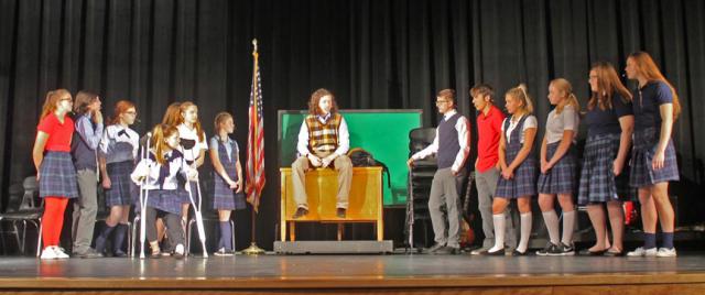 School of Rock opens tonight at 7 pm at the VSHS auditorium. This Andrew Lloyd Webber musical features Ned Schneebly, aka Dewey Finn, played by senior Casey Funk. The story follows the plot of the original Jack Black movie. The slacker Dewey, posing as a teacher, takes a job at prestigious Horace Green Elementary. Along the way he teaches “musical fusion” to 13 fifth grade students, some tired teachers, several over-protective parents, his best friend the real Ned Schneebly, his uptight girl friend Patty, and “the man,” Rosalie Mullins, the principal, played by senior Sarah Schminke.