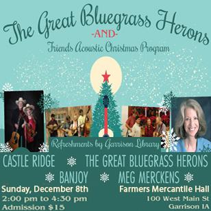 Please join us for a Sunday afternoon of Christmas Music from three great bluegrass bands and a wonderful storyteller! The Great Bluegrass Herons host this Acoustic Christmas Program. They will be joined by Banjoy, Castle Ridge and Meg Merckens. You will enjoy this show!