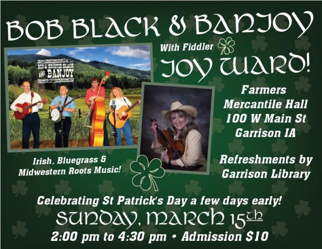 Bob Black and his band, Banjoy, with Fiddler Joy Ward, return to Garrison Sunday, March 15th to celebrate St. Patrick's Day a few days early! Come hear some lively Irish, bluegrass and midwestern roots music! http://banjoy.com/banjoy/ Refreshments by the Garrison Library. https://www.facebook.com/Farmers-Mercantile-Hall-1547304262258648/?view_public_for=1547304262258648