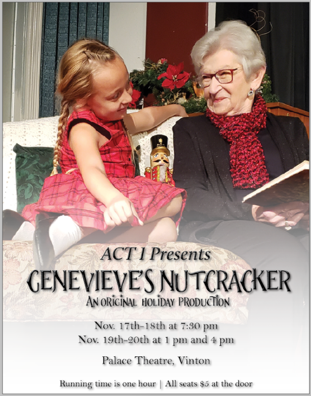 ACT I (Area Community Theatre, Inc.) of Benton County is delighted to present GENEVIEVE'S NUTCRACKER at the Vinton Palace Theatre Thurs.-Fri. Nov. 17th and 18th at 7:30 pm, and Sat.-Sun. Nov. 19th and 20th at 1 pm and 4 pm.