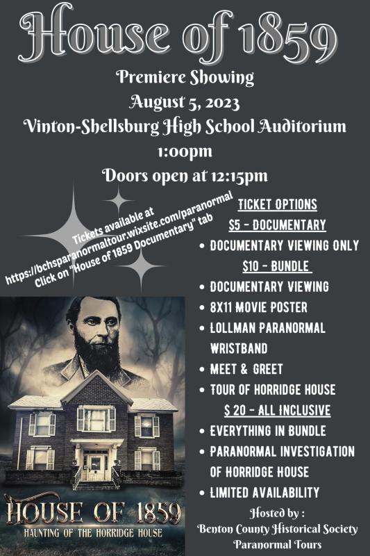 For more information and to purchase tickets please visit the Benton County Historical Society Paranormal Tours website at https://bchsparanormaltour.wixsite.com/paranormal and click on “House of 1859 Documentary” at the top. For general questions you can email bchsparanormaltours@gmail.com.