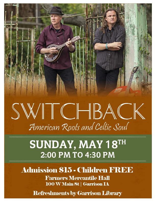 Switchback, featuring the dynamic musical duo of Marty McCormack and Brian FitzGerald returns to Garrison with their unique blend of American Roots and Celtic Soul music. Join us for a Sunday afternoon, May 18 from 2-4:30 p.m. of music, fun and food (by the Garrison Library). An experience you will remember! Hope to see you there!