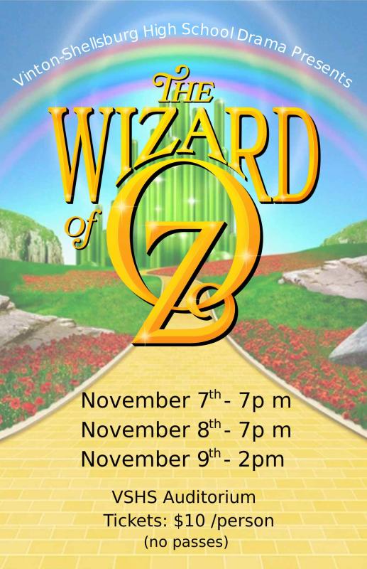 All fall, VSHS Drama has been working to prepare The Wizard of Oz for the stage, just in time to complete your Wicked timeline! We're excited to invite you all to the show on November 7th & 8th at 7:00 p.m., and November 9th at 2:00 p.m. in the Vinton Shellsburg High School Auditorium. Tickets are $10 per person - all proceeds to go to support VSHS Drama and help support future shows.
