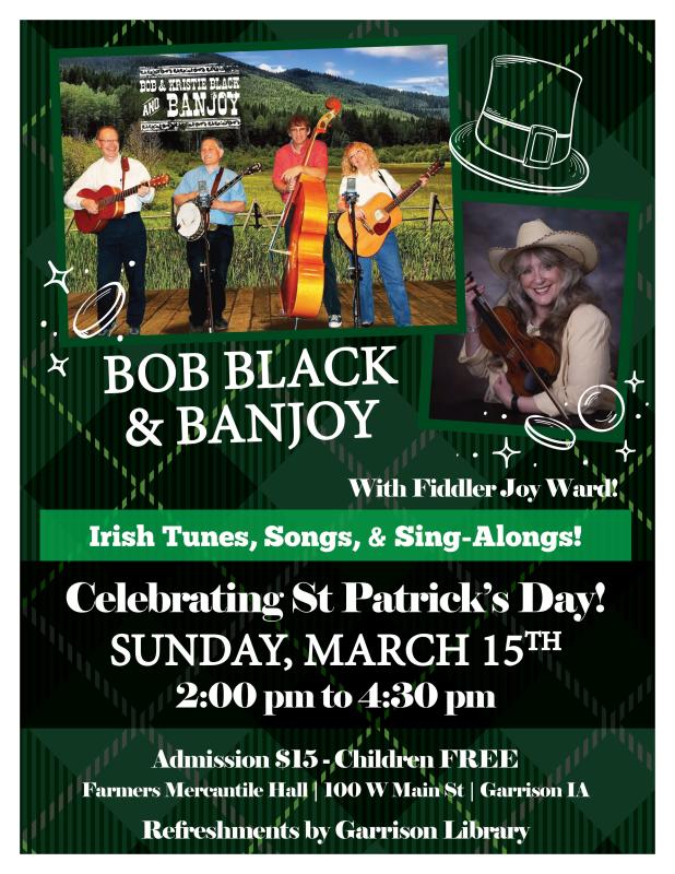Bob Black and Banjoy will be in Garrison to celebrate St Patrick's Day, Bluegrass style, with some lively Irish tunes, songs and sing-alongs, featuring Joy Ward on the fiddle! Be ready for some great music and some delicious refreshments! Hope to see you there!