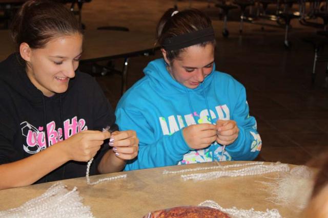 Community volunteer Teresa Strong (background) is helping VSHS CATS cast members create their own cat wigs, based on the Broadway design. Wigs are constructed of yarn, each piece individually separated and glued to a wig head before styling. Miranda Swallom (Gussie), Maddy Springer (Jennyanydots) and Emma Clingman (Grizabella) work on Grizabella's gray wig. Megan Ternus (Coricopat) and Stephanie Berry (Etcetera) help create Victoria's white wig. CATS will be presented on November 4 - 6 at the VSHS auditorium, 7 pm Friday and Saturday, 2 pm Sunday. Tickets, $5 for adults, $4 for students, may be purr-chased at the door.