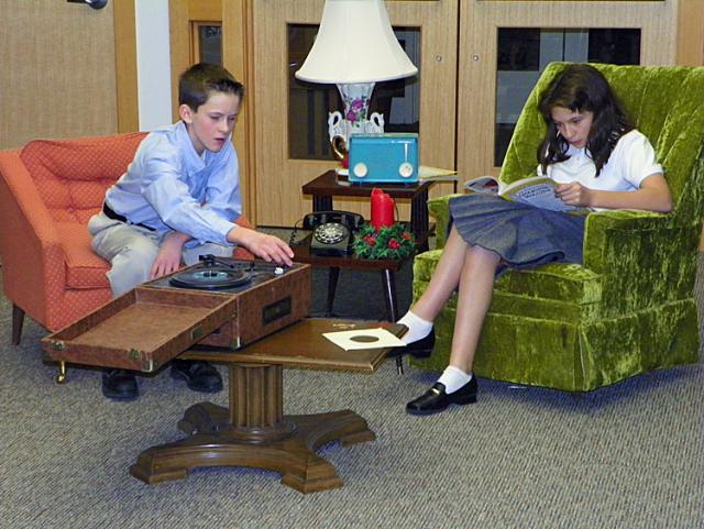 For one thing, it gives you a chance to explain to your child what a "broken record" means. The play is set in 2011, but flashes back to the Christmas of 1960, when typewriters were manual and records were vinyl. The set includes an old record player that still plays 45s; there is also a beautiful turquoise transistor radio on the set (but not turned on); I wondered if it still works. (It does, said Director Steve, whose parents bought it in 1962.)