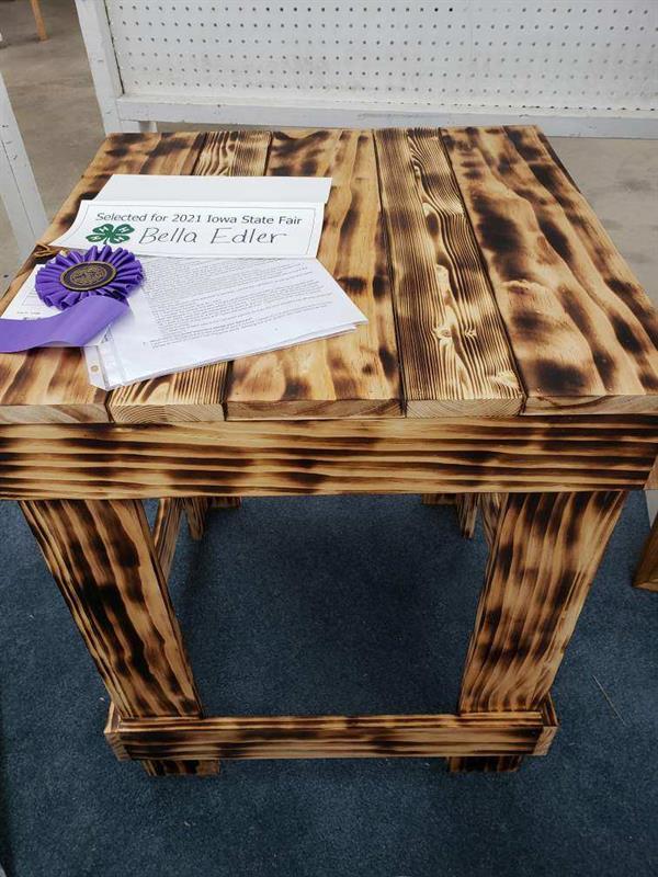 Bella Edler, Blue Ribbon, A nightstand with a rustic burnt pine finish.