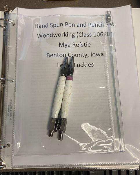 Mya Refstie, Blue Ribbon, A custom-made pen and pencil set made of Corian which glows in the dark blue. These were spun on a lathe. Pen and Pencil is in a zipped pocket inside the 1" white binder