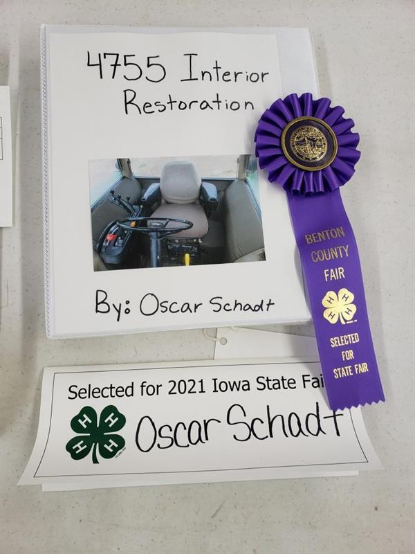 Oscar Shadt, Blue Ribbon, I restored the cab interior of my uncle's John Deere 4755 tractor after it sustained substantial water damage during the Derecho.