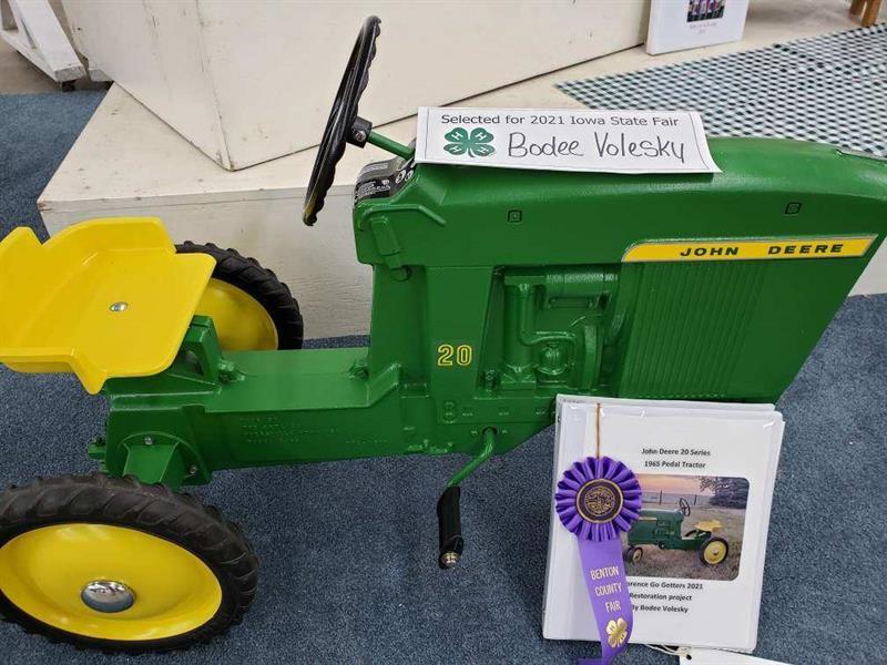 Bodee Volesky. Blue Ribbon, Restored green John Deere Pedal Tractor project.