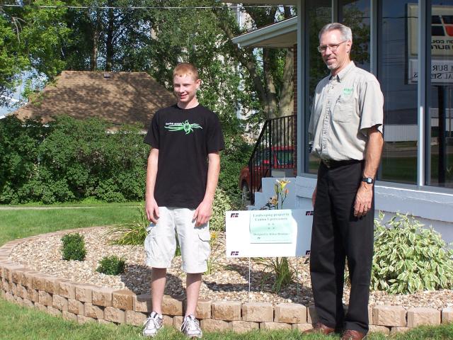 Dillon Brummer, Canton Upstreamers, and David Wrage, Benton County Farm Bureau Federation President, stand by the front of the Benton County Farm Bureau office at 1105 West 9th Street in Vinton. The 4-H Club Canton Upstreamers recently did a landscape project that will be submitted for judging at this year's Benton County Fair. Dillon Brummer designed the project and the Canton Upstreamers group completed most of the work in one day. The Farm Bureau directors and staff are very happy with the results of the landscape project and hope they do well at the fair.