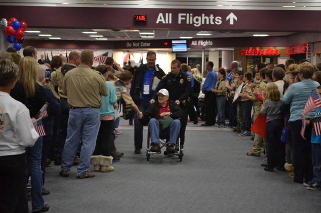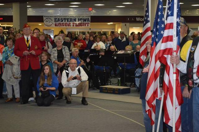 The event ended with the traditional welcome home ceremony at the Eastern Iowa Airport, where veterans groups, Scouts and other organizations join veterans' family members in welcoming them back to Iowa and thanking them for their service.