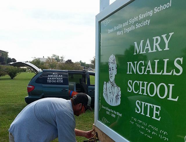 Scott Wood, owner/operator of All American Handyman in Vinton, finished installing the second Mary Ingalls School Site sign at the IBSSS Sunday, August 3. The sign can be seen off Highway 218. The first sign was installed by the main entrance to the school.