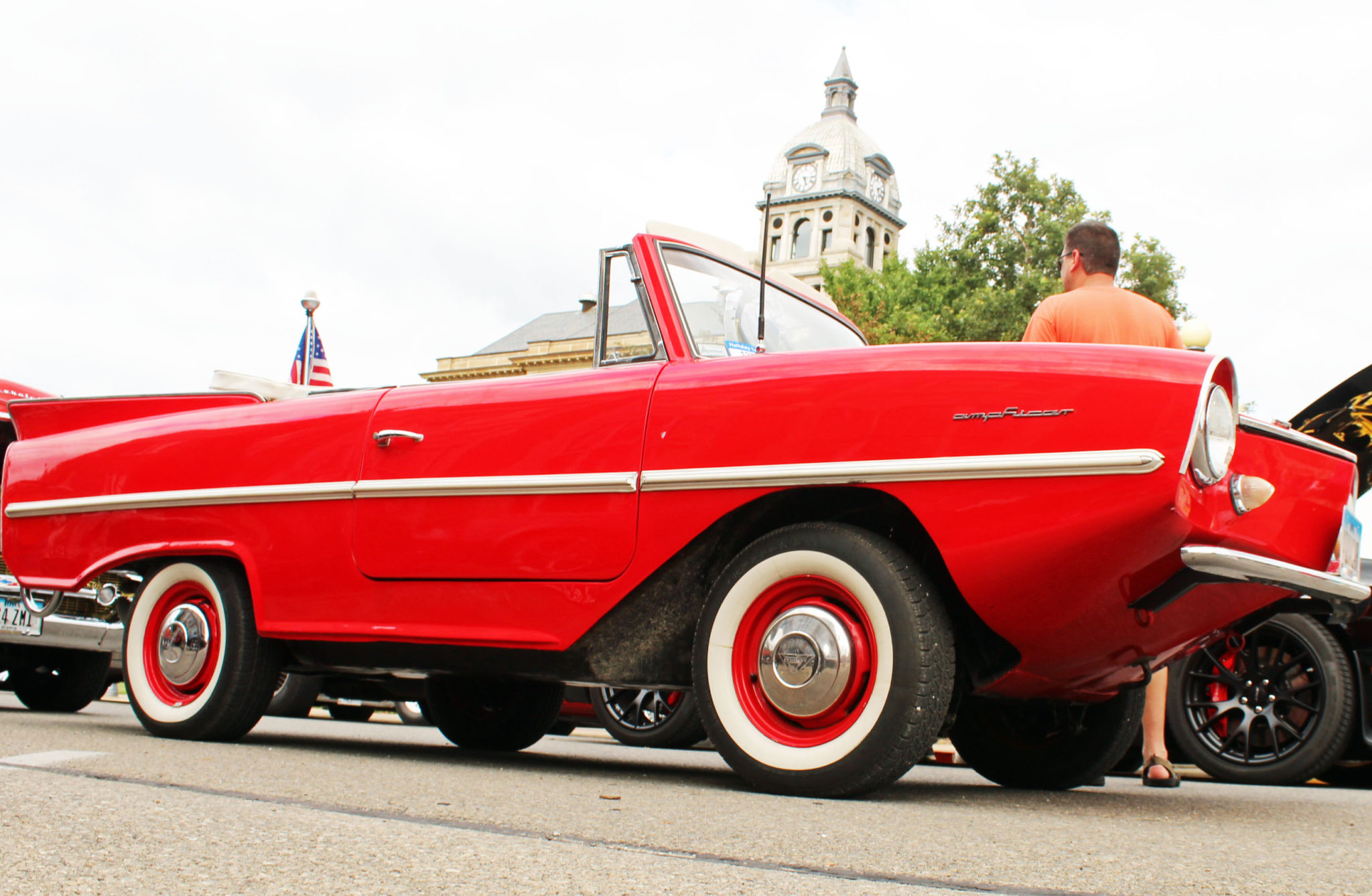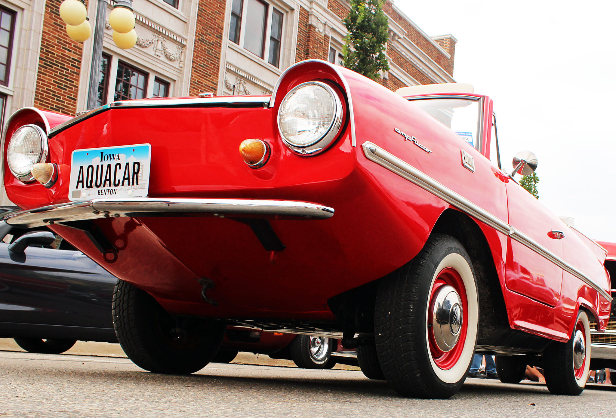 A red and white AmphiCar made passers-by stop and look twice, first at the white life-saving ring attached to the trunk, and then at the dual propellors between the back tires.
