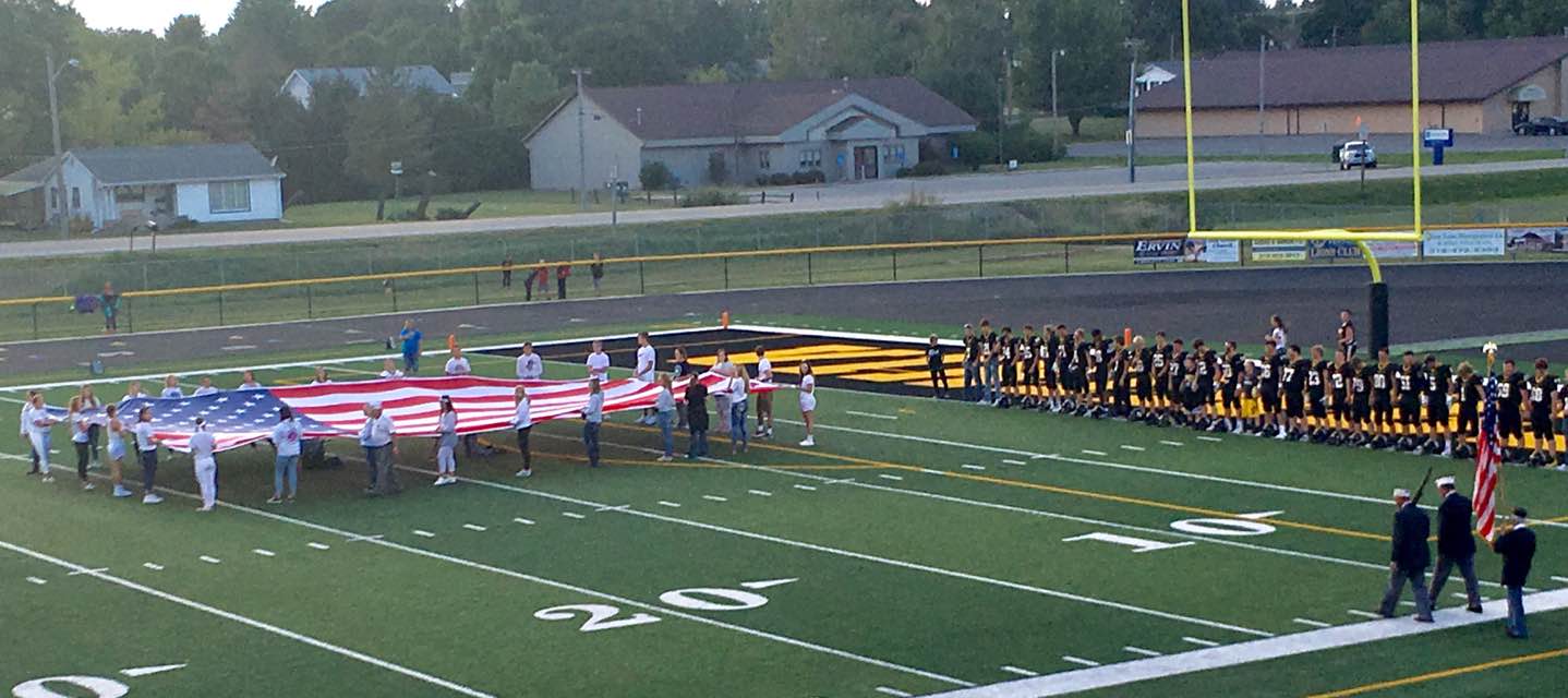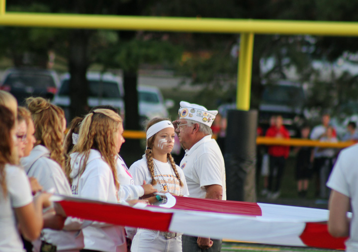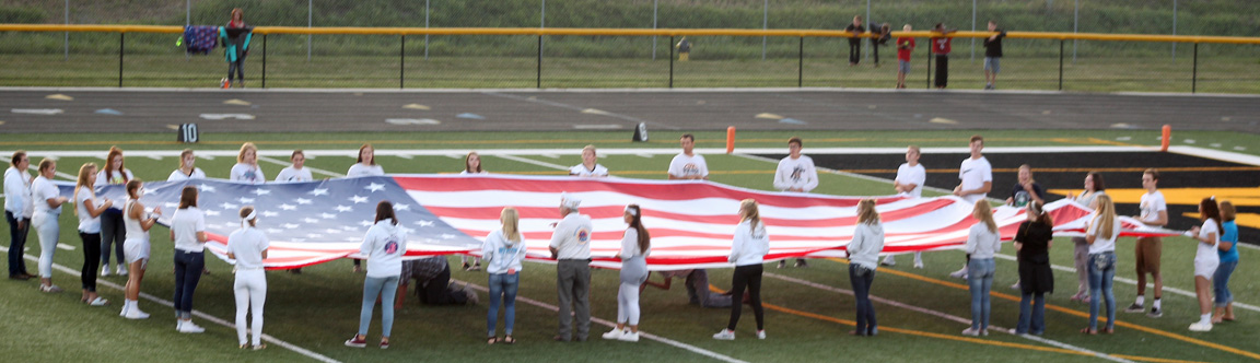 A 45-foot long U.S. flag, carried by Vinton-Shellsburg High School students, covered a portion of the football field, as veterans marched to midfield for the National Anthem during pre-game ceremonies on Friday.