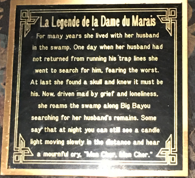 Like Vinton, Iowa's legends of historical characters who drowned in the Cedar River, Vinton, La., has a similar Legende de la Dame Du Murais, a ghost who allegedly haunts the swamp while looking for her deceased husband. McCaughey created a monument to this legend, which is permanently on display inside city hall. Mayor Stinson told me that Vinton leaders occasionally bring the Madame to trade shows, as an informal representative of the town. Be sure to look for her when you visit Vinton, La.