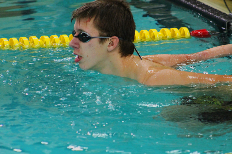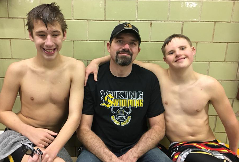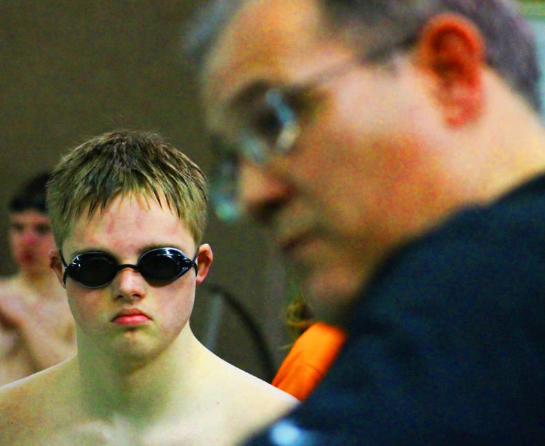 Zach's father, Mike, thanked Coach Levis and the rest of the VS/CPU team for all of their work with him. "I think most importantly we have to thank Rob for his dedication and caring," says Mike Kramer. "He truly cares about each student succeeding -- not only in swimming but all aspects of life. Here is a coach who now has 2 students with special needs, two students that at one point couldn't swim. Look at them now they can swim because of him and his dedication towards all students. I go to almost every practice and I see how Rob works with the whole team, I see how much time is also spent, and devoted to having two athletes succeed, whether it's one-on-one time with Rob or team managers working with them." Zach's dad is impressed with how Levis works with all athletes, regardless of skill levels. "While at the same time pointing out flaws and things to work on with the rest of the team, Rob has an excellent rapport with the swimmers," says Kramer. "He is very good at commending all successes. Last season Zach received lots of one-on-one time and this season Sage has. The improvements are impressive. What seems like minor details to many are huge milestones for these two boys. Zach, at practice this season, mainly practices with the rest of the team and follows the practice plan like everyone else, while Sage this year receives needed one-on-one time. It's interesting for me because watching sage is a reminder of where Zach was and where I know Sage will be in the season to come. It's a reminder of how much work these boys do to get to where they are at. Not only would I thank Coach Rob Levis but the whole team. This team treats everyone equally and they also show their support to Sage and Zach. When they can demonstrate or assist in any way, they will, they cheer on their teammates, congratulate them and make them feel as part of the team. Last night's debut for Sage was another milestone in which I was not only excited for him and everyone involved but also thankful for everyone involved! Go VS CPU Storming Vikings!" Zach Kramer listens to Coach Rob Levis as he prepares for his event. Mike Kramer, Zach's dad and long-time Special Olympics assistant who worked with Sage Holmes and Zach, relaxes with them during a break between events. Sage's parents also expressed their thanks to all who have helped him this season. "We want to thank Coach Rob, all of Sage's teammates, and the managers, who have really helped out," says Jeff. Teammate Cyrus Elwick says he has seen both Zach and Sage work hard and improve much since joining the team. "Zach has improved a lot. He's come a long way from when he first started. And Sage, on the first day of practice was using a kick board to help keep him up, but now he doesn't need it. All I can say for them both is that they've both come a long way since their first day of practice," says Elwick. Grinnell won the meet, 57-37. See complete results here:1051_001 See more photos of the meet, including photos of Sage and Zach, HERE. Watch Sage during his first relay below: [embed]https://www.youtube.com/watch?v=9CFqYFW5lHM&app=desktop[/embed]