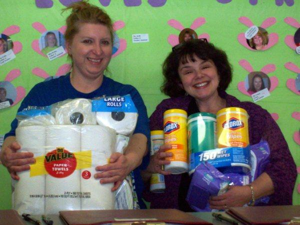 The Vinton Chapter of TTT participates in monthly community outreach projects to support those who serve our community. Here, TTT member Susan Lent (right) and Happy Time Child Development Center Director Sharyl Ruport are shown with the items donated to the center. Similar items were also donated to the HACAP Headstart Preschool and Daycare.