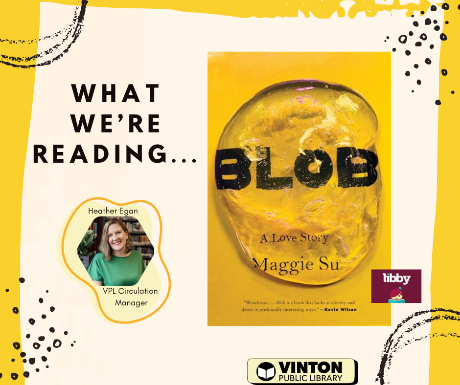 A patron asked me if I read romance novels recently. I told them no—unless you count the book I am currently reading on the Libby App: 'Blob: A Love Story' by Maggie Su. It features a sentient blob found behind a drag bar who, after a steady diet of cereal and pop culture, becomes a handsome man that looks like Brad Pitt. Very standard romance material, right?