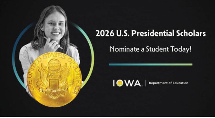 Do you know an outstanding Iowa high school senior who excels in academics, career and technical education or the arts? The Iowa Department of Education is now accepting nominations for exceptional student leaders in each of these categories for the prestigious U.S. Presidential Scholars program, one of the highest honors a student can achieve. Educators, family members and other community members are encouraged to submit a nomination for an exceptional Iowa student. From your nominations, Iowa will select up to 30 students for consideration for the national program designation.