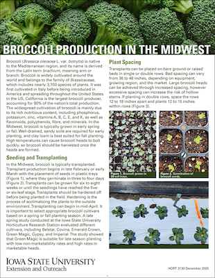 The publication covers the production cycle from seed transplanting to harvest, including specific fertilizer recommendations based on soil tests, irrigation requirements, optimal spacing for quality head development and weed, pest and disease management best practices. Findings are shared from studies conducted by horticulture researchers at the ISU Horticulture Research Station in Ames, Iowa.