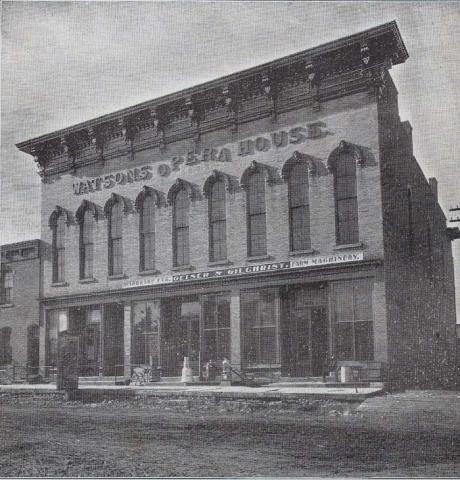The Cresent Opera House sottd, for a time, at the corner of A Avenue and Fifth Street (then known as Beckett and Concord Streets). The Watson Oper house, bulit in 1873, seated 800 patrons and \"compared favorably to any opera house in Iowa. It replaced and earlier, more modest, Watson Hall wich burned.