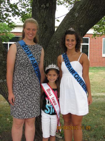 The 2012 Benton County Fair Queen Felicia Hertle of Keystone and Natalie Hanson of La Porte City attended the Watermelon Days parade in Atkins IA on August 4, 2012 and had the opportunity to meet Priya Christensen of Atkins who is the National American Miss Iowa Jr. Pre Teen. Also pictured is Felicia Hertle who participated in the 2012 Iowa State Fair Competion where she competed against 102 girls.