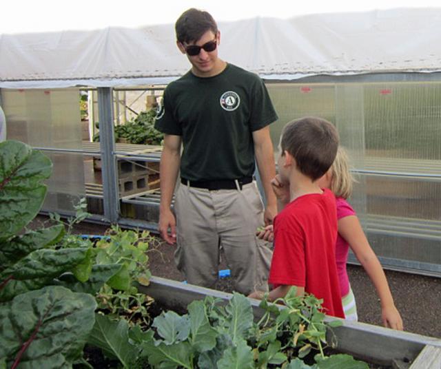 Photo caption: NCCC Cedar 4 Team Leader Joe is educating the two campers on what vegetables are growing in the bin.