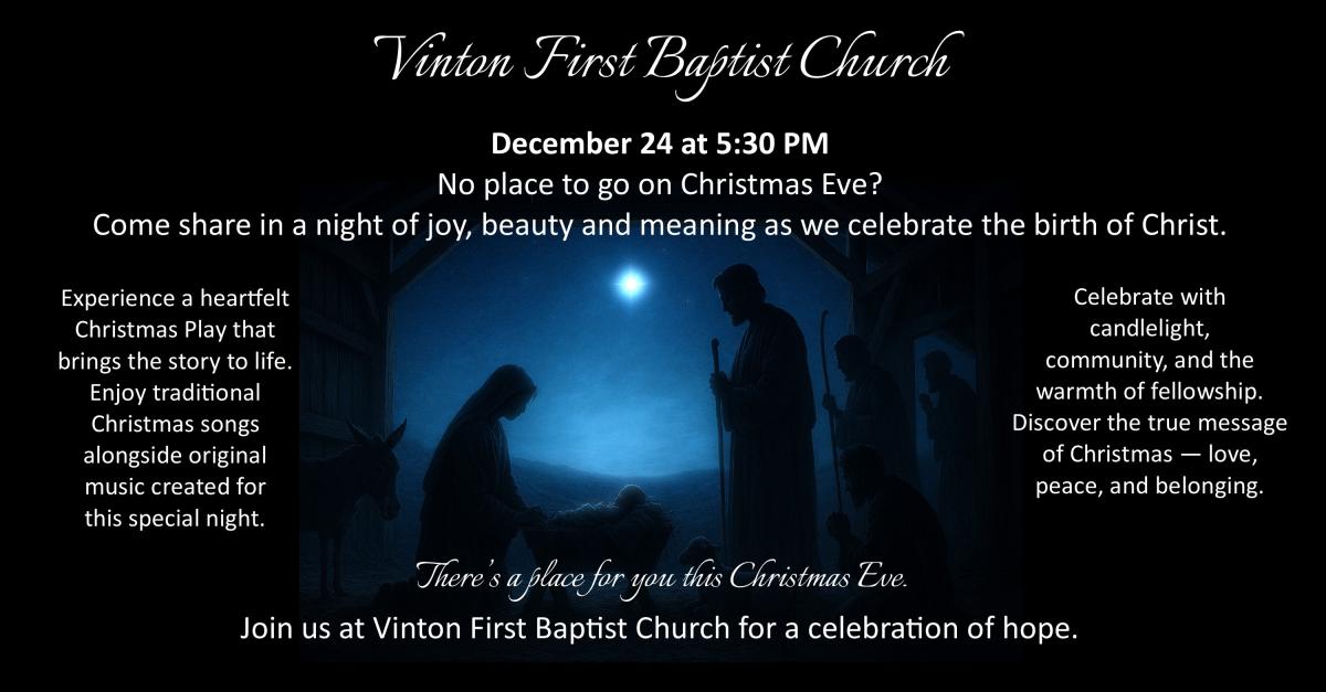 No place to go on Christmas Eve?  Visit Vinton First Baptist Church on December 24 at 5:30 PM.
