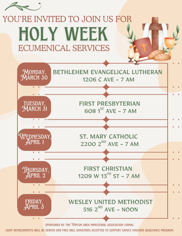 Offering collected at each service will go to support food and gas vouchers for the community through the Vinton Area Ministerial Association (VAMA).