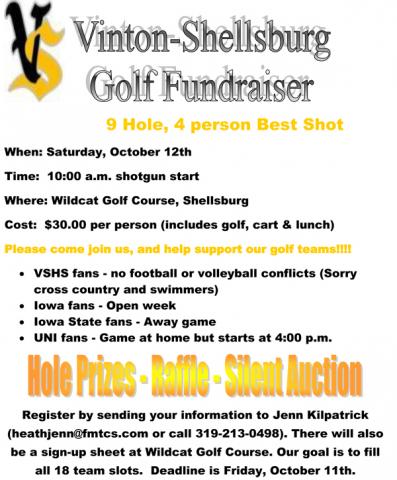 It is a four person 9 hole best shot to be held Saturday, October 12, 2013 at Wildcat Golf Course in Shellsburg at 10:00 a.m. with a shotgun start.