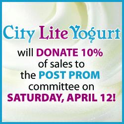 City Lite Yogurt is donating 10% of sales to the Post Prom committee on Saturday, April 12. Celebrate the arrival of warmer weather with a sweet yogurt treat that supports the upcoming 2014 Post Prom event. City Lite Yogurt is located at 200 W. 4th St, Vinton, IA 52349