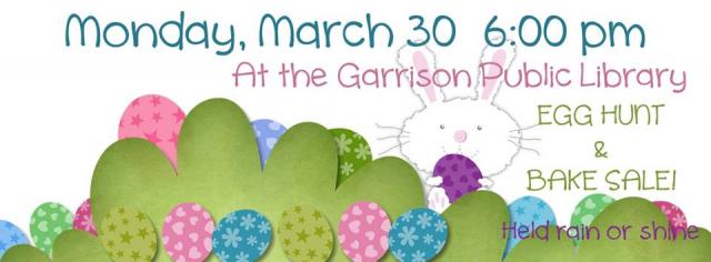 The Garrison Library Board is organizing an Easter Egg Hunt and Bake Sale on Monday, March 30th @ 6:00 pm. It will be held rain or shine at the new library.