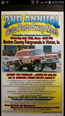 The 2nd annual auto parts swap meet will take place Saturday, July 18, at the Benton County Fairgrounds. Admission is $5. See details in the attached flyer.