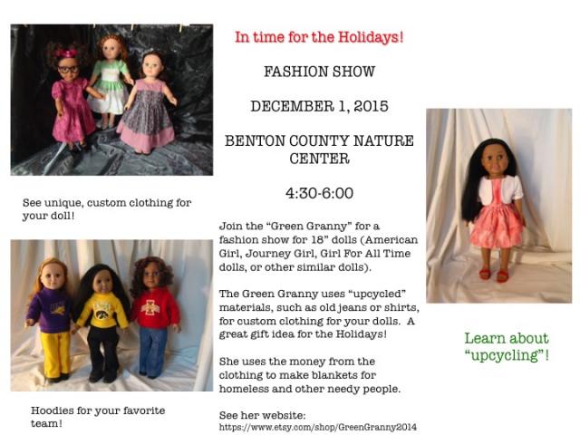 The Green Granny is putting on an "upcycled" fashion show for dolls at 4:30 p.m. Tuesday, Dec. 1, at the Benton County Nature Center.