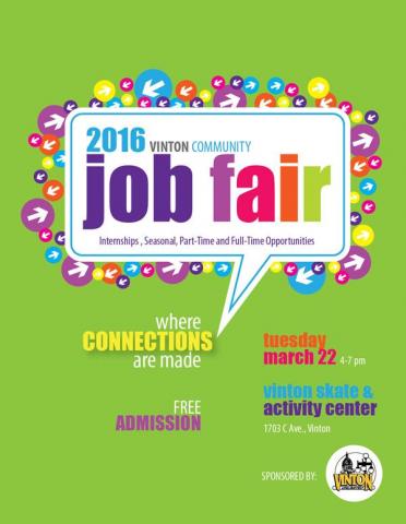Are you looking for a job? Is it time for a switch? Visit the Vinton Community Job Fair on Tuesday, March 22 from 4-7pm at the Vinton Skate & Activity Center. Local businesses that are looking to hire will have booths and applications available!