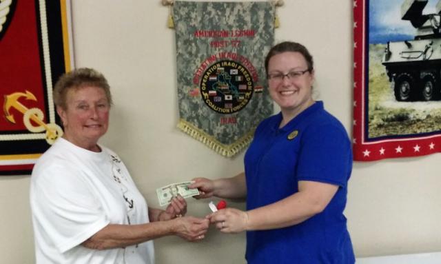 Vinton American Legion Auxiliary President Raela Uthoff presents the first red poppy to Vinton American Legion Commander Bobbi Enos at the Legion Hall; the members will be selling poppies to raise money to help other veterans.
